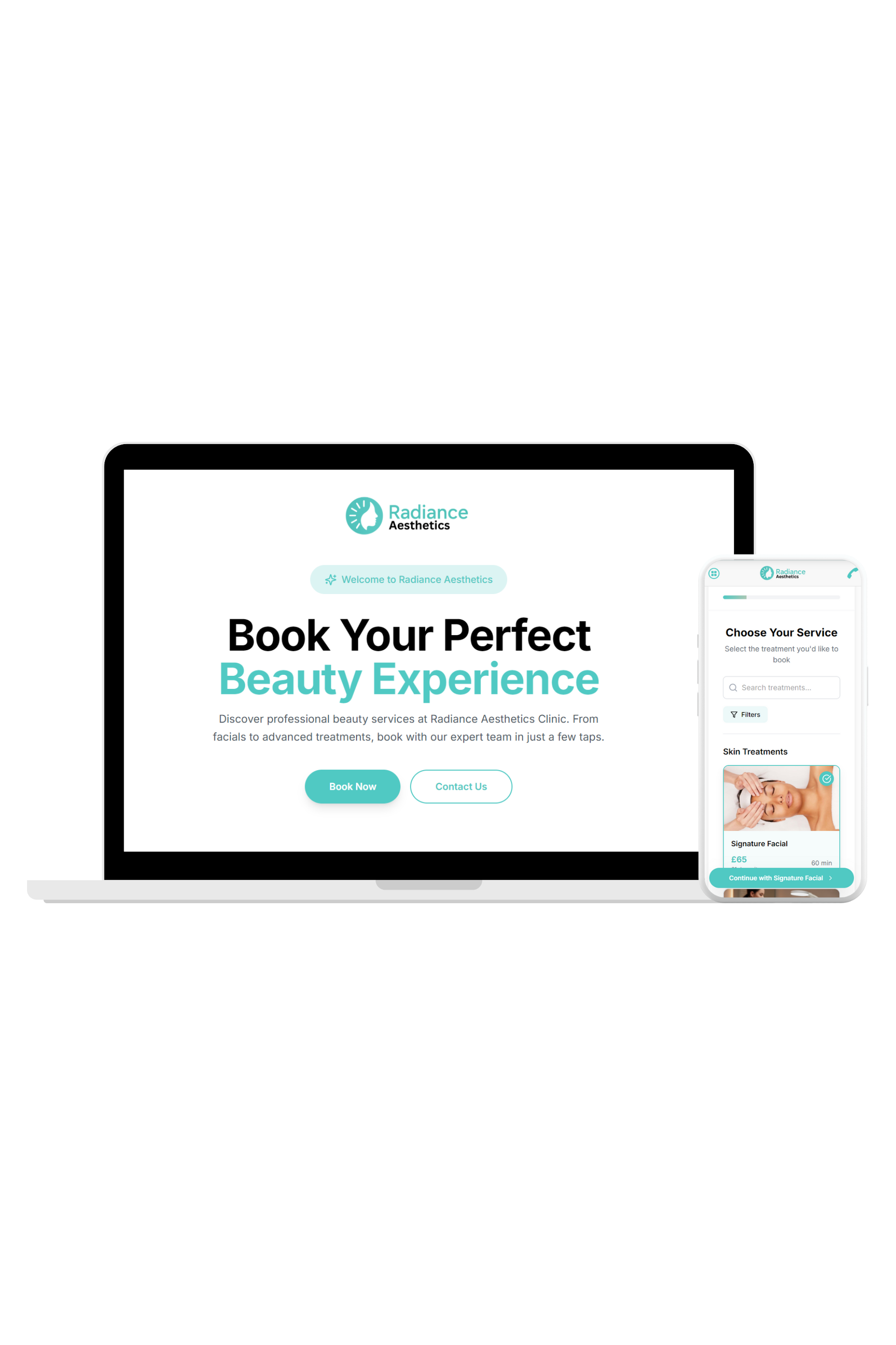Tap the Radiance Aesthetics demo app (below on mobile) and see how smooth bookings feel, how clean the design is and how effortless the client journey becomes. Imagine this same power, tailored to your business, with your services, your branding and your automations running behind the scenes.